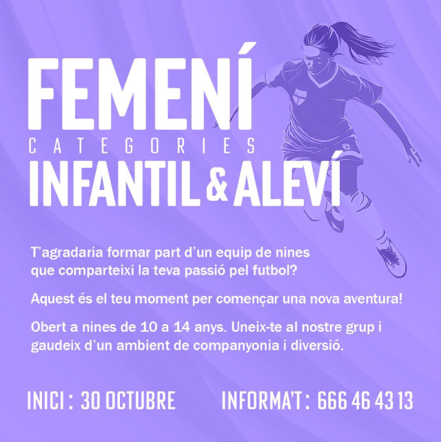 Si tens entre 10 i 14 anys i t’apassiona el futbol, aquest és el teu moment! Estem cercant noves jugadores per començar amb força — quantes més siguem, millor serà l’aventura!