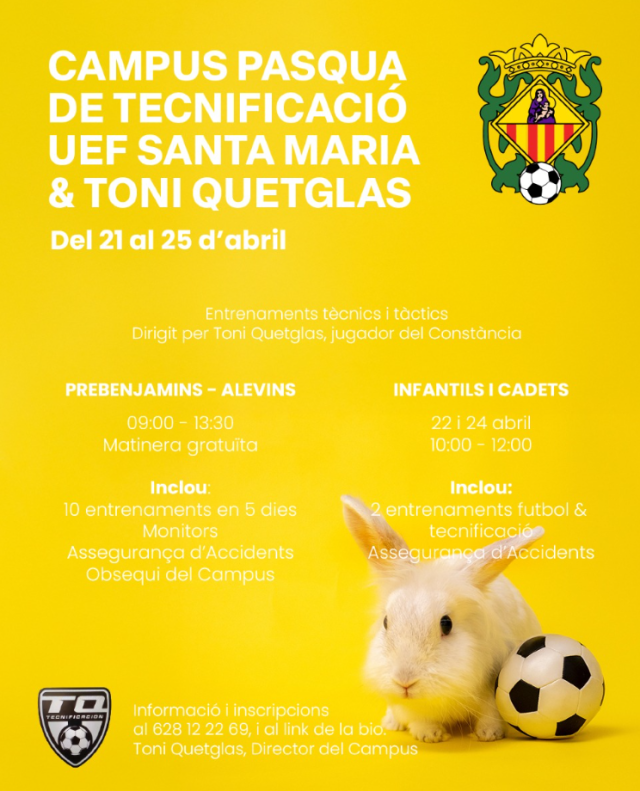 Ja és aquí el campus de Pasqua de Toni Quetglas i la UEF Santa Maria! Si vols millorar la teva tècnica, gaudir del futbol i passar uns dies plens d’esport i diversió, aquest campus és per a tu! INSCRIPCIONS OBERTES! Places limitades! Més info i inscripcions al 628122269 (Toni) i al formulari de Google: https://docs.google.com/…/1FAIpQLSdIWFGnSDjJsy…/viewform